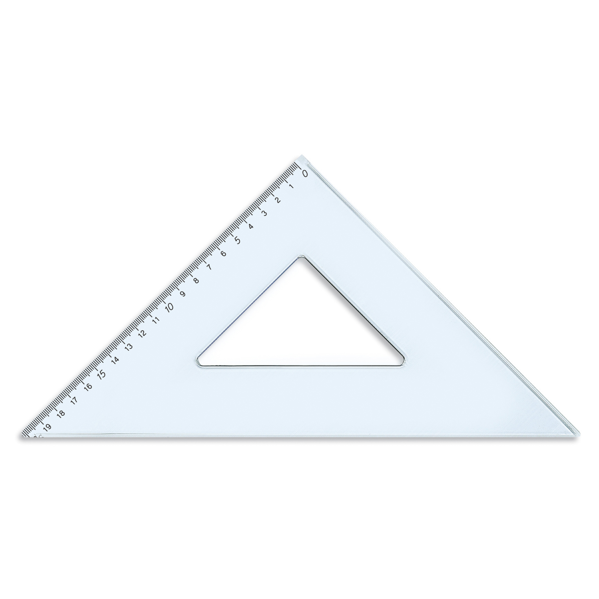 Squadra in materiale plastico. Smusso tirachina e bordo interno. Punte arrotondate di sicurezza. Con milimetratura speciale invertita da destra verso sinistra.