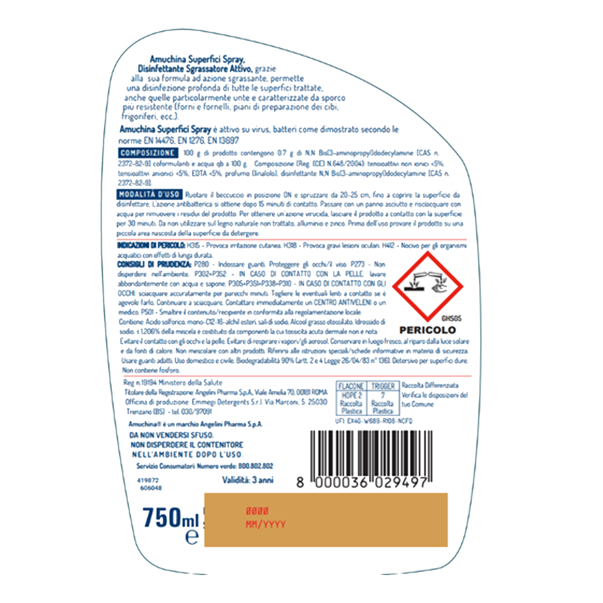 Info sui prodotti "Superifici Spray Multiuso battericida e virucida - 750 ml - Amuchina Professional"