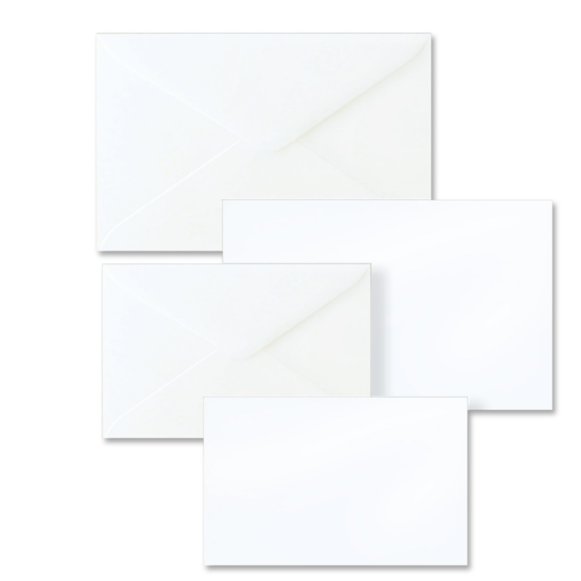 Confezione appendibile in PPL con 10 cartoncino bianco da 200gr liscio con 10 buste coordinate con patella e taglio a punta.