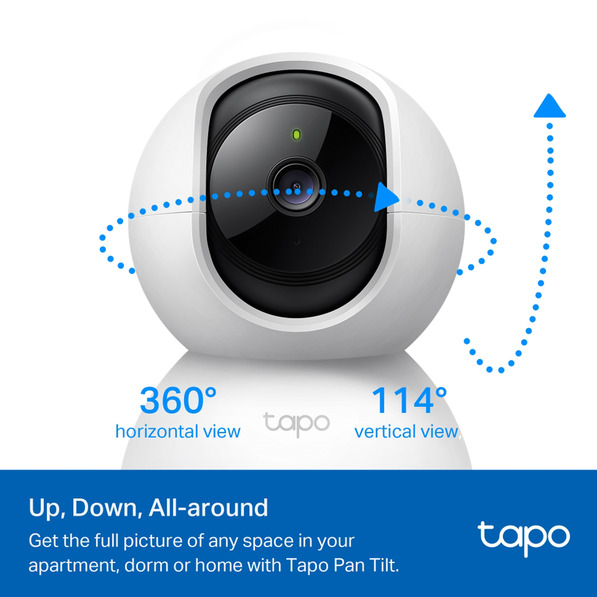 Telecamera ad alta definizione 1080p con rotazione orizzontale a 360° e verticale a 114° e visione notturna LED IR 850 nm fino a 30 ft. Audio bidirezionale, visualizzazione live e modalità privacy che disattiva la sorveglianza. La telecamera memorizza a 128 GB su una scheda microSD†, equivalenti a 384 ore (16 giorni) di registrazioni. La confezione contiene: Telecamera TC70, alimentatore, guida rapida, base per la telecamera, viti di montaggio. Alimentazione: 100–240VAC, 50/60Hz. Dimensioni 85,4x86,8x117,7mm.