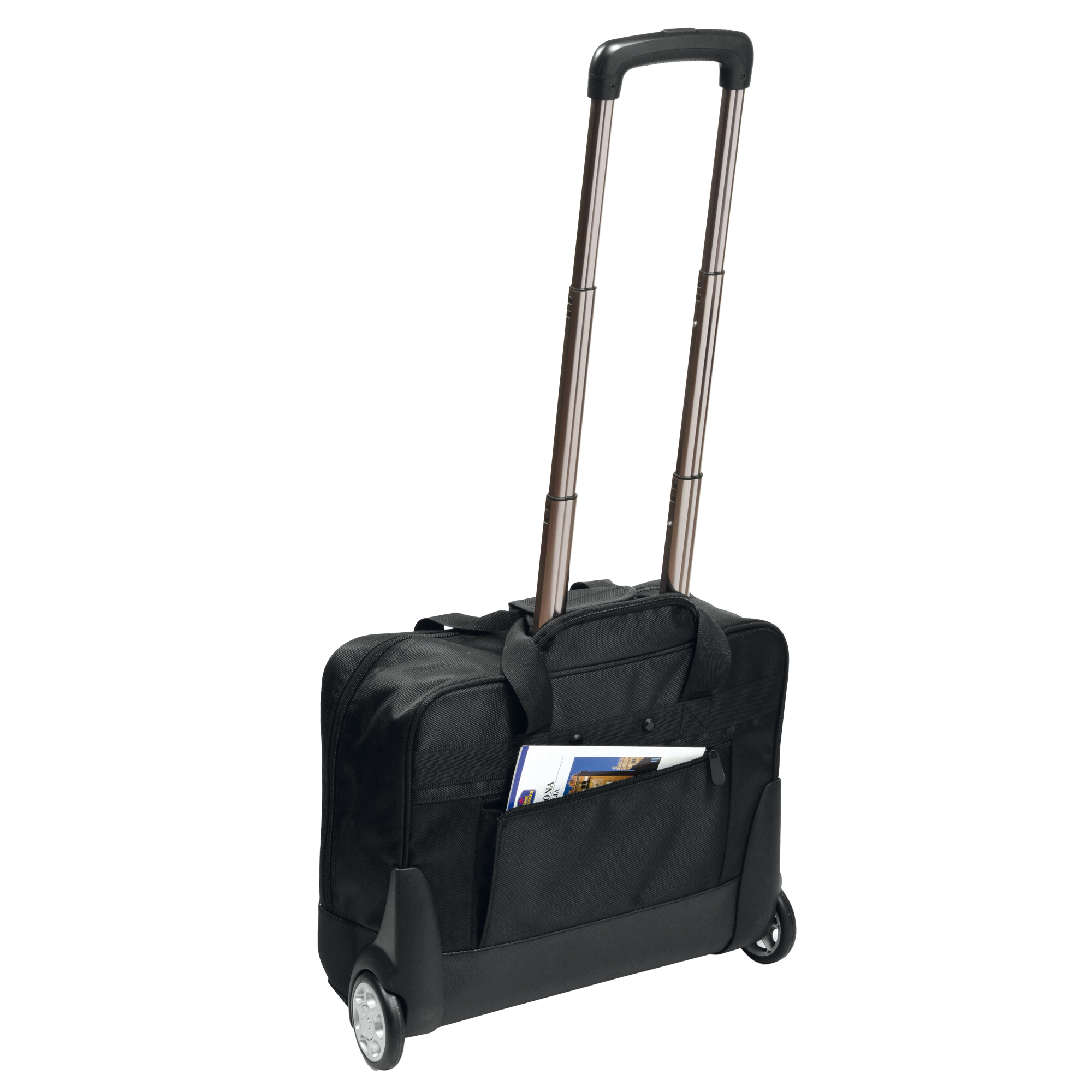 Trolley in tessuto tecnico extra strong. Grande scomparto centrale con divisorio. Tasca frontale con cerniera e vani portaoggetti. Impugnatura extra comfort. Manico telescopico a scomparsa. Dimensioni: 42x38x17cm.