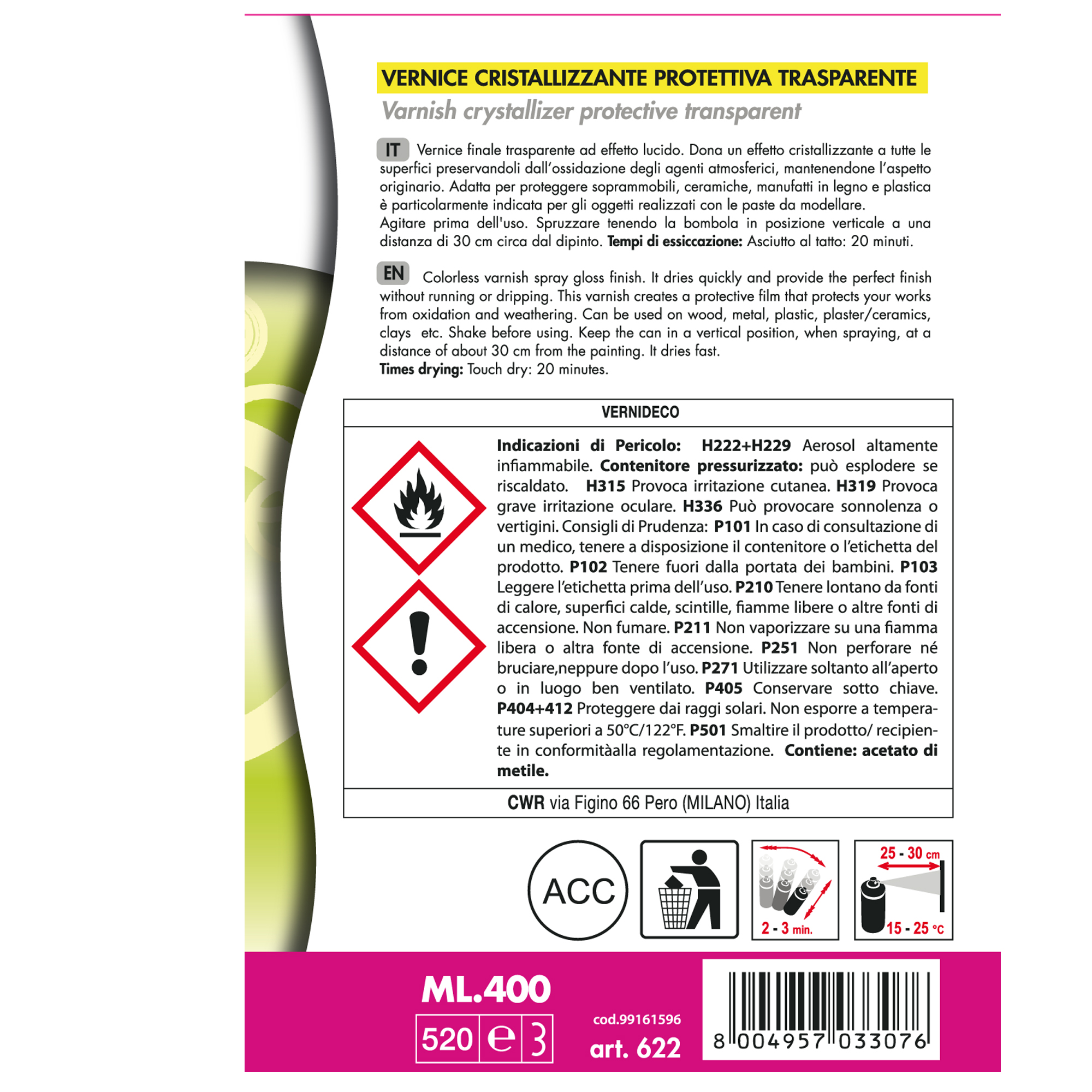 Vernice in spray cristallizzante trasparente che dona agli oggetti un effetto laccato e ceramico. Non ingiallisce nel tempo. Molto resistente alla luce e agli agenti atmosferici. Aderisce tenacemente ad ogni tipo di supporto (carta, tela, ceramica, porcellana, pasta di sale, argilla, creta, vetro, metallo, plastica, ecc) si utilizza semplicemente spruzzando sull'oggetto conferendo un aspetto brillante, lucido ed omogeneo. Conforme alle normative cee sulla sicurezza.